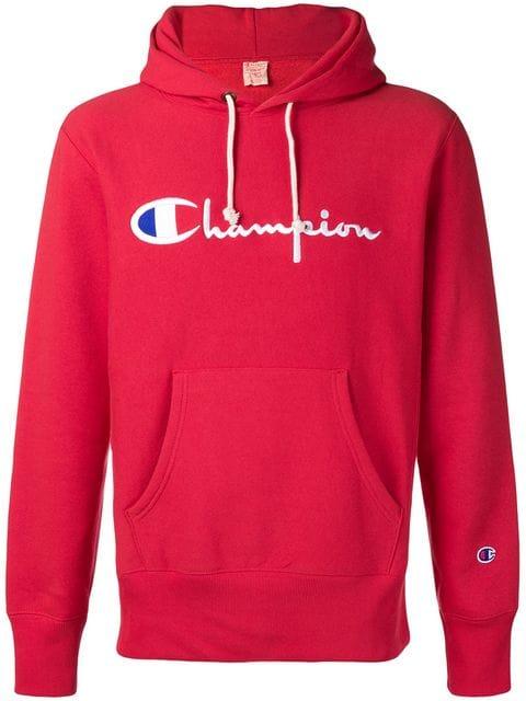Champion Logo Embroidered Long Sleeve Hoodie In Red Modesens